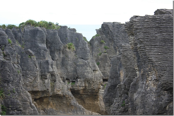 The Punakaiki Blowholes are supposed to look like this “when the tide is right”. However, although we made a special (third) trip out to the rocks at high tide, it turned out that not only the tide, but also the sea had to be right. The day we were there, the “tempestuous Tasman” was as calm as a millpond, and so the blowhole didn’t blow.