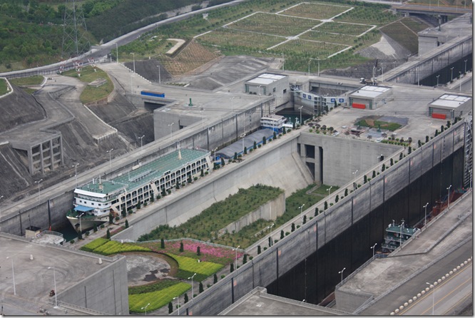 In the left hand lock, you can see a cruise ship like ours and another couple of boats, with more boats lined up outside, waiting to come in.